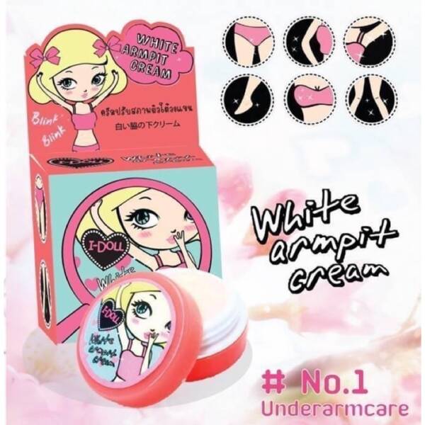 • I-Doll White Armpit Cream is a creamy light pink-orange cream that visibly whitens armpits (underarm skin), and dissolves hyper-pigmentation and deep dark spots on underarms with every use!